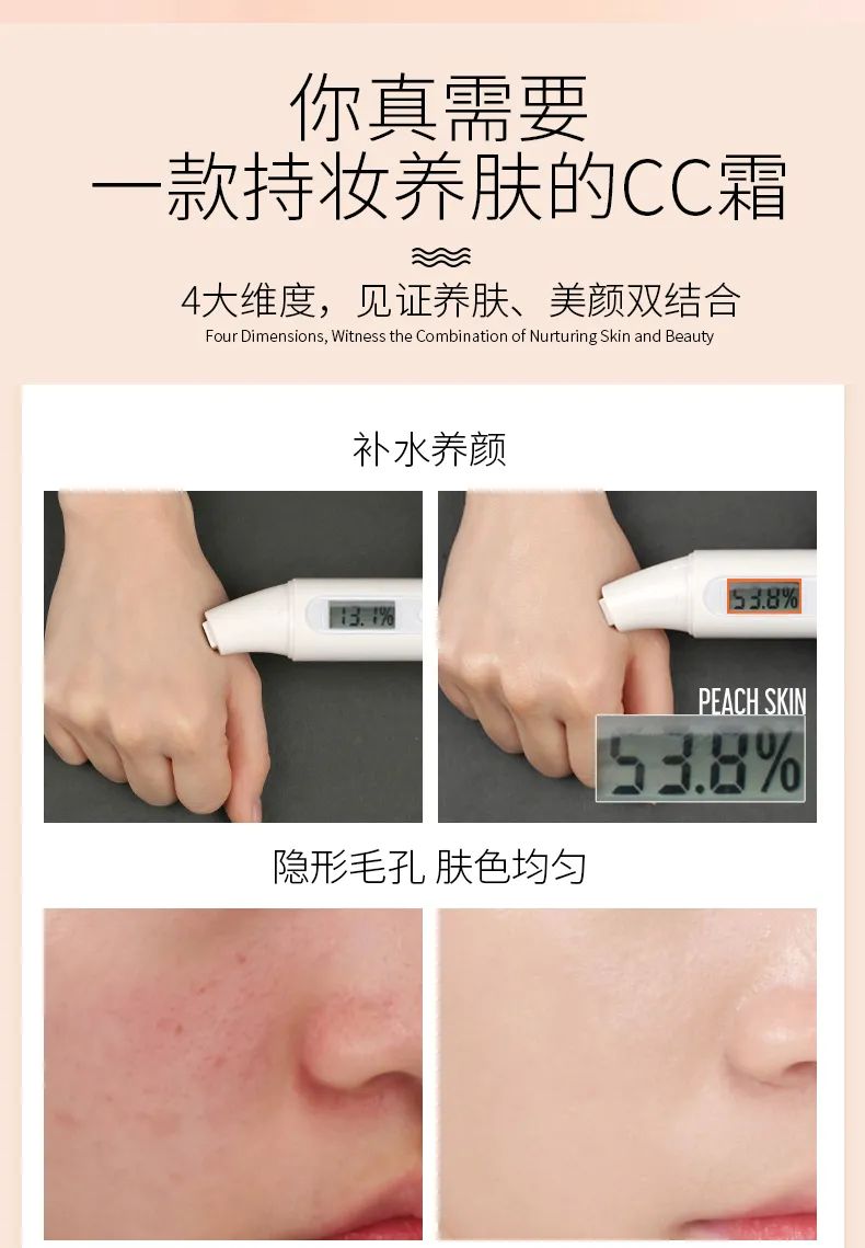 细腻亲肤 高倍持妆 轻薄服帖 锁定柔光雾面 易浮粉? 易脱妆? 补妆难? 那你可能需要一款持妆养肤的CC霜 启用丝绸般细致柔滑的液态配方, 持久保湿,均匀肤色; 能够有效遮盖面部细纹、斑点等瑕疵。 -持久力MAX 实力不脱妆- 均匀肤色,调肤细养, 持久不脱妆,助你轻松上阵。 呵护你的肌肤一整天 【 七效合一 】 ☑ 遮瑕 ☑ 隔离 ☑ 养肤 ☑ 提亮 ☑ 保湿 ☑ 补水 ☑ 修颜 CC霜的功效 一瓶全搞定 【 打造无暇美颜裸肌 】 抗氧提亮 质感裸肌 真正的自带磨皮美颜滤镜 妆感全天细腻幼滑 【好粉扑 缔造精致底妆】 模拟蜂巢储蜜原理 将CC液紧锁于具有1000000万 微气孔的海绵气垫粉芯内 有效控制出量液 打造轻薄透亮的水润妆感 - 30秒快速上妆 - 细腻柔软的气垫粉扑 令妆容如丝绸般柔嫩细滑, 缔造精致底妆。 【使用方法】
