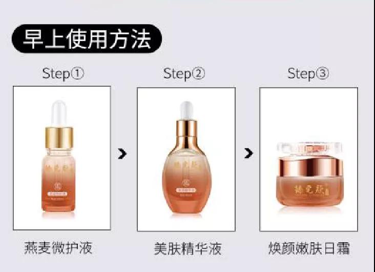 <焕颜靓肤系列> 自然透白,一步到位 重磅来袭 ⊙焕颜嫩肤日霜 淡化黑物,帮助代谢体内多余黑色沉淀物,匀肤靓肤 ⊙美肤精华液 淡化色斑,有效淡化面部斑点,瞬间年轻10岁 ⊙美肤靓颜晚霜 细致嫩滑,平衡肌肤小粗糙,告别凹凸不平 ⊙燕麦微护液 提亮肤色,祛斑、嫩肤之余,帮助肌肤提亮不止一个度 < 核心成分 > 1 燕麦仁提取物 燕麦仁提取物(AVENA SATIVA (OAT) KERNEL EXTRACT)从燕麦仁中提取的天然产物。具有美白保湿和护理肌肤的功效。能促生天然胶原蛋白,提升肌肤弹性。亦具有抗氧化能力,有效延缓肌肤衰老。 2 芍药 芍药提取物对弹性蛋白酶的抑制、对自由基的消除、对氮氧化物生成的抑制以及对组织蛋白酶活性的促进等,均显示芍药提取物具有活肤抗衰的功能,抗衰老。并且有比较好的保湿能力。 3 烟酰胺 烟酰胺能够加速新陈代谢,促进胶原蛋白的合成,防止黑色素过度沉着,达到美白的效果。同时能够减少黑色素的沉积,避免皮肤变黑。可以控制油脂的分泌,同时达到缩小毛孔的目的。 4 透明质酸钠 被称为“肌肤年轻灵魂”,能改善肌肤生长条件,赋活再生年轻肌肤,逐渐解决肌肤问题,使得肌肤变得更细滑、紧致Q弹,明亮清透,是一种天然的保湿剂。 <焕颜套组两大功效> ⊙7天焕肤、淡斑、淡黄气 ⊙从源头抑制黑色素的形成 <功效测试> 7天淡斑,无惧年龄 <使用方法> 从肌底养出白皙发光肌