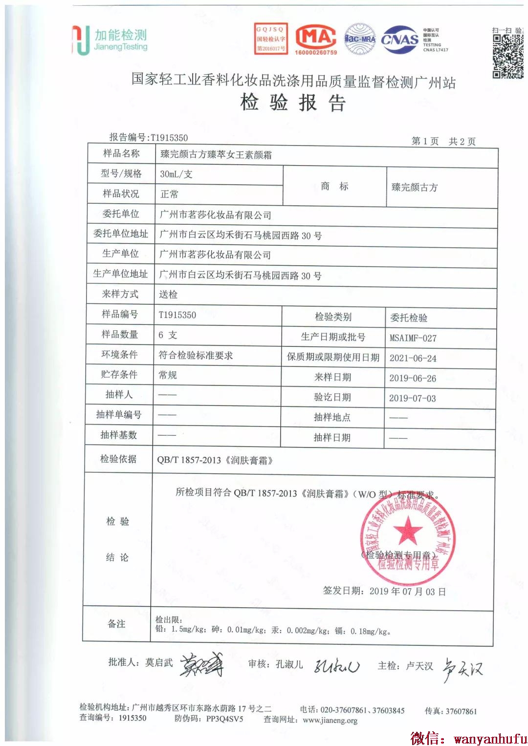 臻完颜臻萃女王素颜霜检验报告
