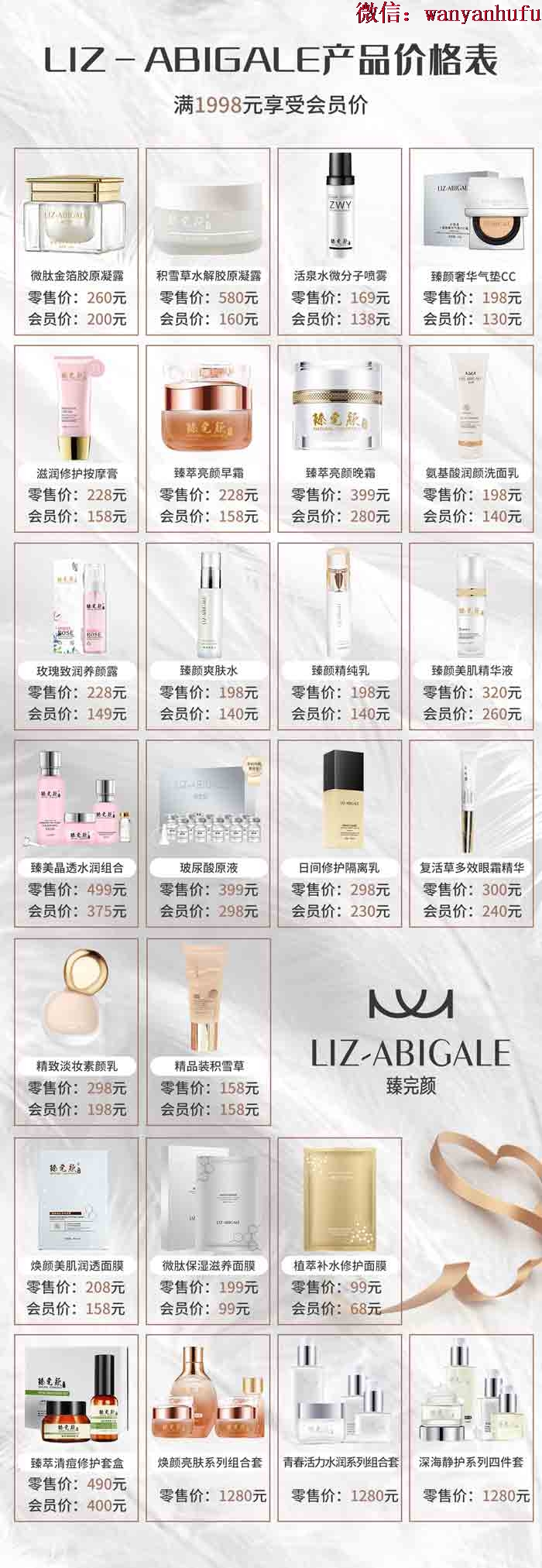 这里介绍的是统一零售价与会员价,会员价是消费满1998元终身享受咱们的会员价,还是非常实惠的。这张图片涵盖了现有臻完颜护肤品几乎所有产品,如果上图没有的新品,可以直接咨询我们的微信即可。